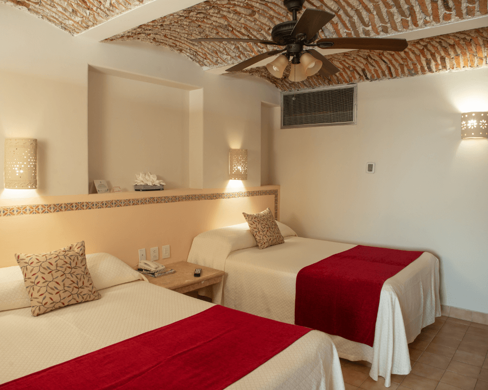 Suite room featuring one bedroom with two double beds, a living room with two sofas that can be used as single beds, air conditioning, bathroom, cable TV, telephone, iron, hair dryer, alarm clock, and a fully equipped kitchenette with blender, microwave, coffee maker, toaster, two-burner stovetop, refrigerator, and a private balcony with ocean view.