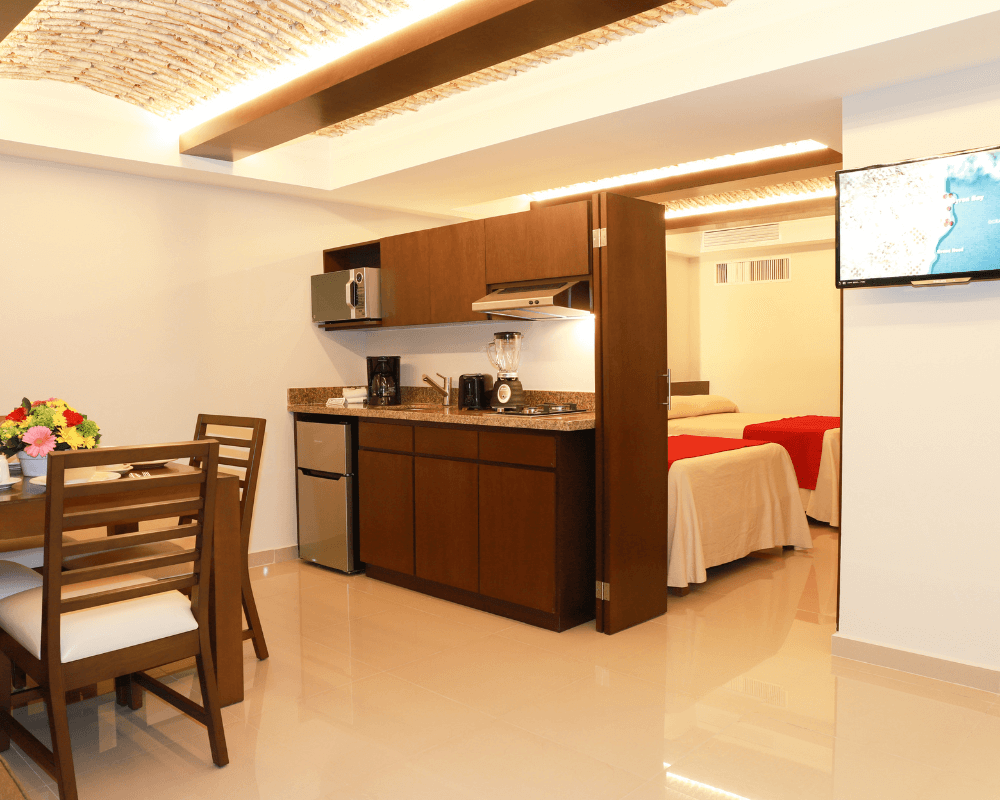 Suite room featuring one bedroom with two double beds and a sofa bed that can be used as a full-size bed, air conditioning, bathroom, cable TV, telephone, iron, hair dryer, alarm clock, and a fully equipped kitchenette with blender, microwave, coffee maker, toaster, two-burner stovetop, mini fridge, and a private balcony with ocean view.