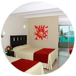 Cuenta con dos camas matrimoniales, aire acondicionado, baño, televisión por cable, plancha, secadora para cabello, reloj alarma, teléfono, algunas habitaciones con vista al mar y otras con vista a la ciudad.